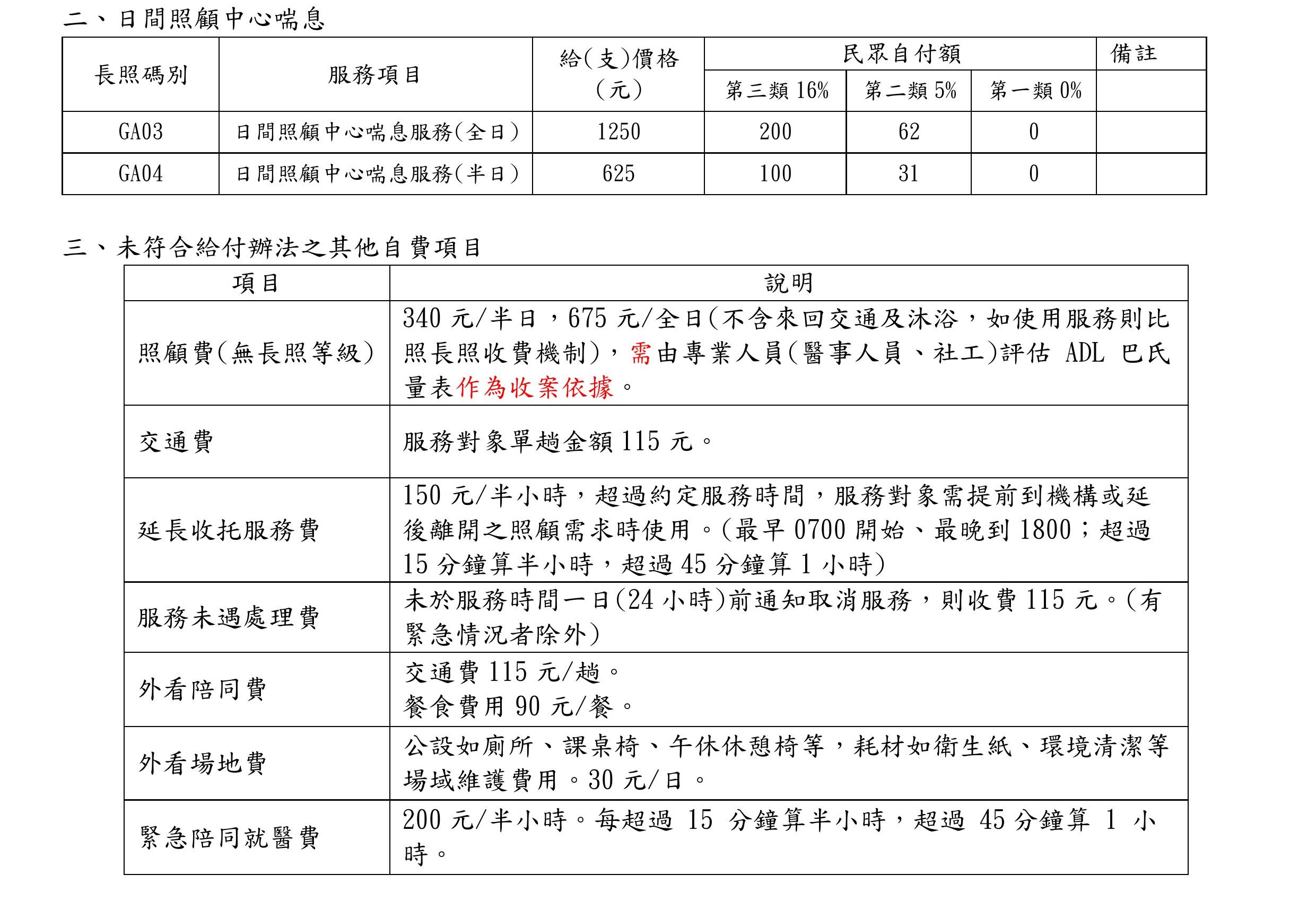 新豐綜合長照機構-收費標準