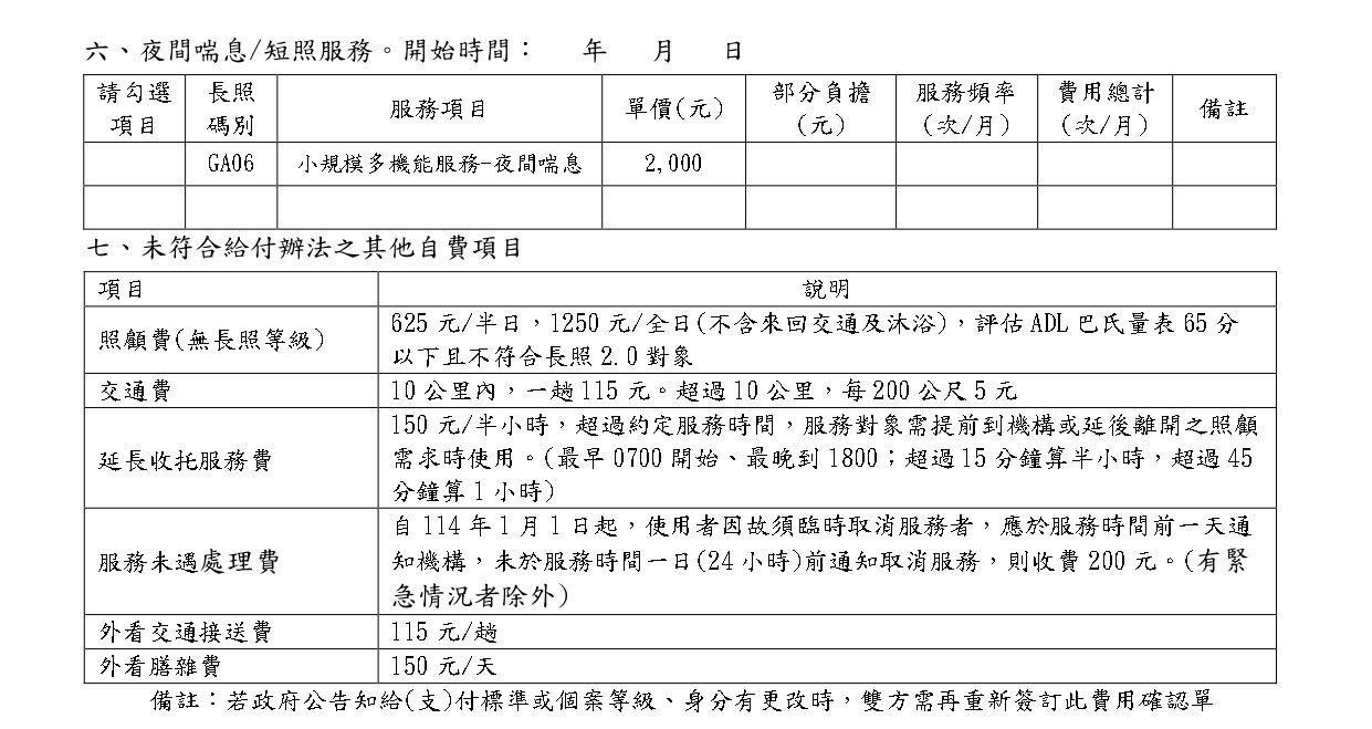 居家式服務收費標準表