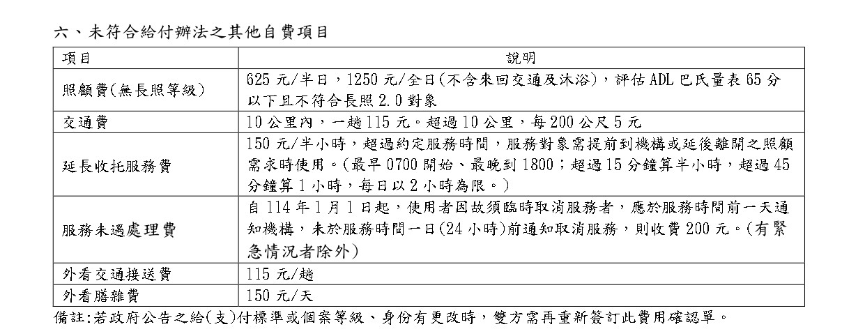 大雅綜合長照機構-收費標準